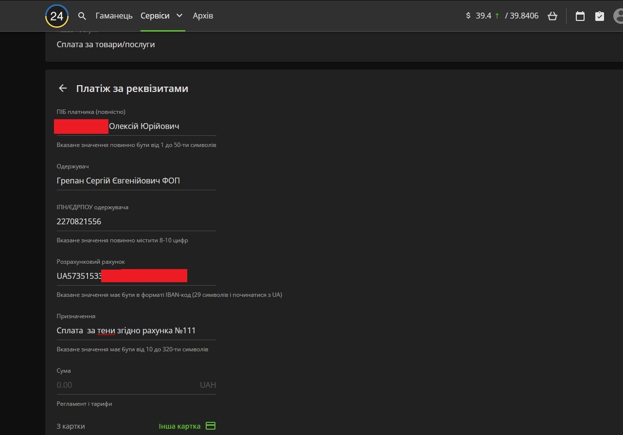 Оплата счета по реквизитам в Приват24