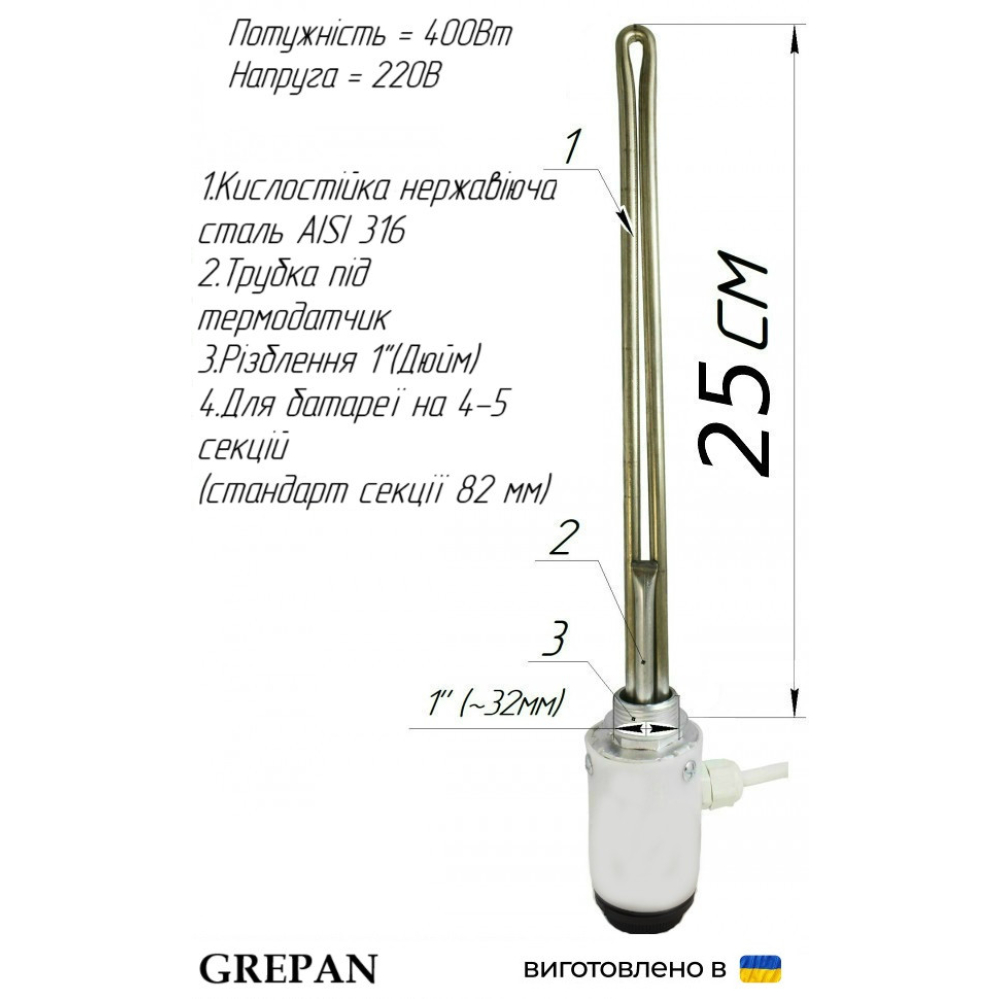 В нашем интернет-магазине можно купить ТЭН: ТЭН для алюминиевого радиатора с механичным терморегулятором 0.4 кВт (1" левая) - bat050-1. Также широко представлен ассортимент ТЭНы для алюминиевых и биметаллических радиаторов. Широкий ассортимент ТЭНов и нагревательных элементов в магазине grepan.uaХарактеристики:Напряжение, В: 220Мощность, кВт: 0,4Резьба крепления: 1" ліваМатериал оболочки: Нержавейка, AISI 316LПогружная длина, см: 25Пайка/сварка: сваркаРекомендуемое количество секций батарей: 4-5Наполнитель ТЭНа: периклазРазмеры трубы: 7х0,5Материал крепления: Углеродистая стальДлина резьбы крепления, мм: 12Метод изготовления крепления: точеныйТерморегулятор тип: механическийЦвет пластика: білийДлина кабеля: 1,7 м..