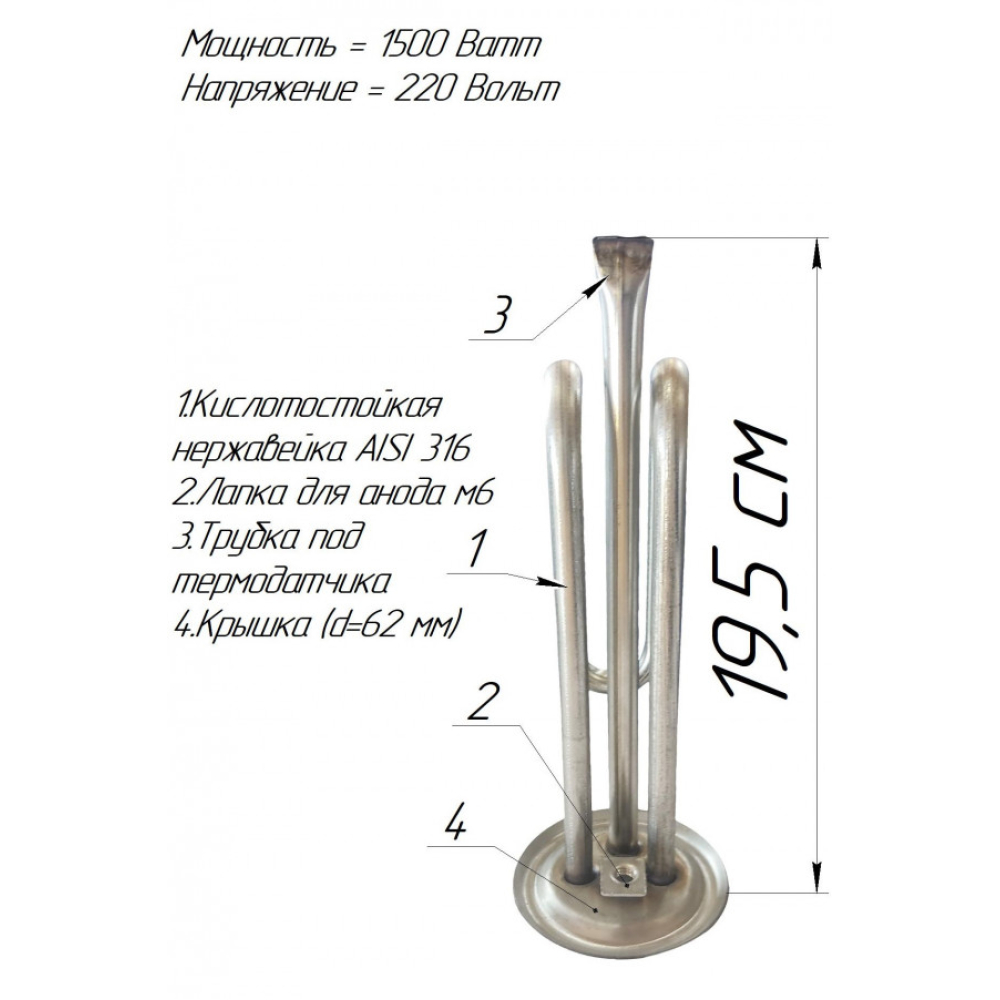 В нашем интернет-магазине можно купить ТЭН: ТЭН для бойлера нержавеющий, 1,5 кВт, №37 - boi037. Также широко представлен ассортимент ТЭНы для бойлеров. Широкий ассортимент ТЭНов и нагревательных элементов в магазине grepan.uaХарактеристики:Напряжение, В: 220Мощность, кВт: 1,5Резьба крепления: 63Материал оболочки: Нержавейка, AISI 316LПогружная длина, см: 28Пайка/сварка: сваркаНаполнитель ТЭНа: периклазРазмеры трубы: 9х0,7Контакт: Контакт "папа"Материал крепления: Нержавейка AISI304Трубка под термодатчик: 1Метод изготовления крепления: штампТолщина пластины, мм: 1Диаметр трубок под термодатчики: 6Среда использования: водаМесто под анод: М6..