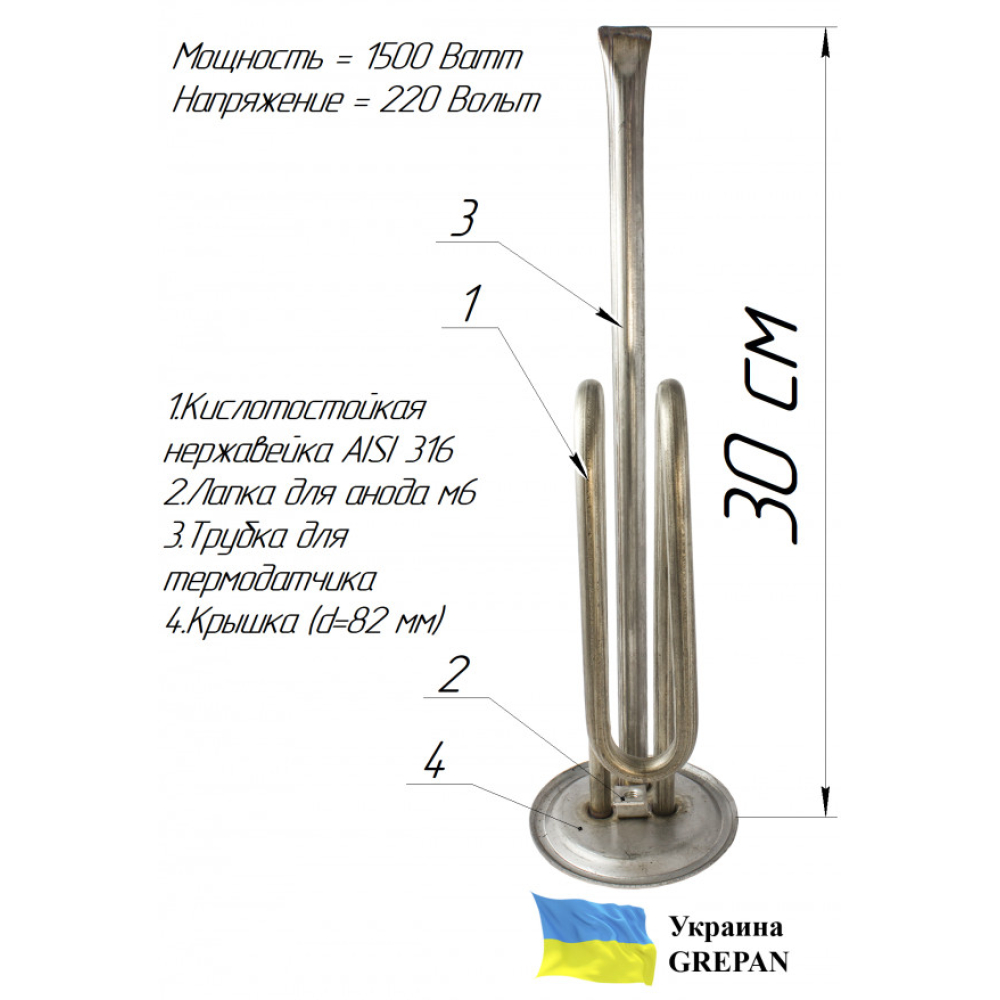 В нашем интернет-магазине можно купить ТЭН: ТЭН для бойлера нержавеющий, 1,5 кВт, №15 - boi015. Также широко представлен ассортимент ТЭНы для бойлеров. Широкий ассортимент ТЭНов и нагревательных элементов в магазине grepan.uaХарактеристики:Напряжение, В: 220Мощность, кВт: 1,5Резьба крепления: 63Материал оболочки: Нержавейка, AISI 316LПогружная длина, см: 40Пайка/сварка: сваркаНаполнитель ТЭНа: периклазРазмеры трубы: 9х0,7Контакт: Контакт "папа"Материал крепления: Нержавейка AISI304Трубка под термодатчик: 1Метод изготовления крепления: штампТолщина пластины, мм: 1Диаметр трубок под термодатчики: 8Среда использования: водаМесто под анод: М6..