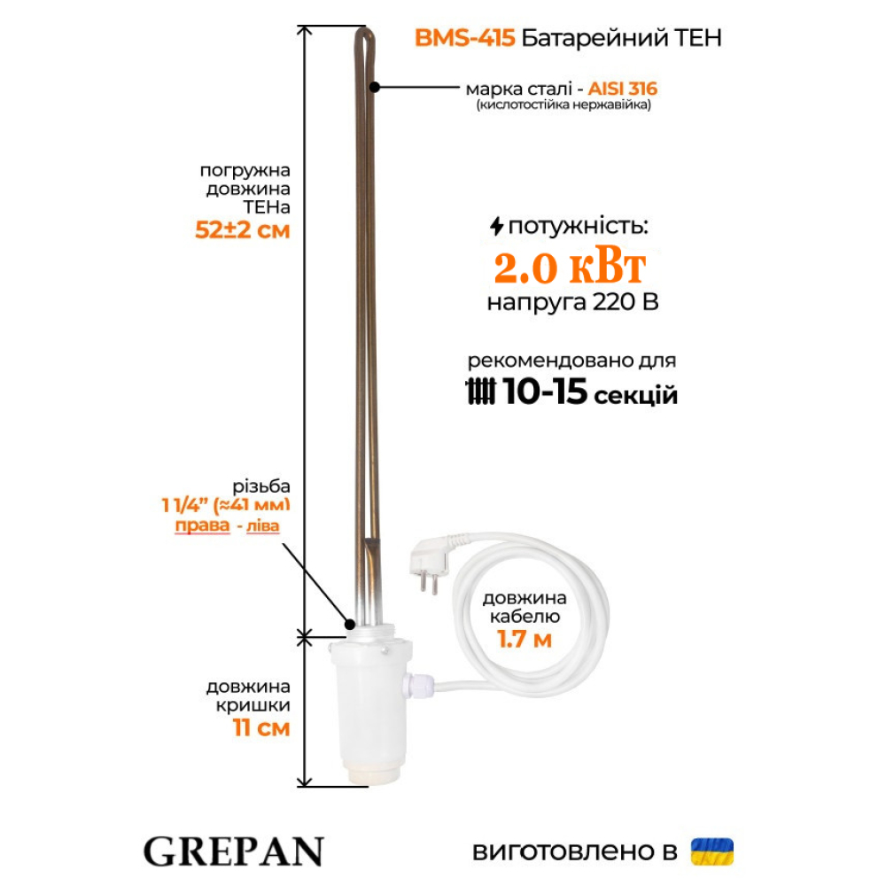 У нашому інтернет-магазині можна купити ТЕН: ТЕН для чавунних радіаторів з механічним терморегулятором 1 1/4'', 1,5 кВт - bat35. Також широко представлений асортимент ТЕНи для чавунних батарей. Широкий асортимент ТЕНів та нагрівальних елементів у магазині grepan.ua.Характеристики:Потужність, кВт: 1,5Різьблення кріплення: 1 1/4" праваМатеріал оболочки: Нержавійка, AISI 316LЗанурювальна довжина, см: 52Пайка/зварювання: зварюванняРекомендована кількість секцій батареї: 10-15Наповнювач ТЕНу: періклазРозміри труби: 7х0,5Матеріал кріплення: Вуглецева стальДовжина різьби кріплення, мм: 12Терморегулятор тип: механічнийМетод виготовлення кріплення: точенийКолір пластику: білийДовжина кабелю: 1,7 м..