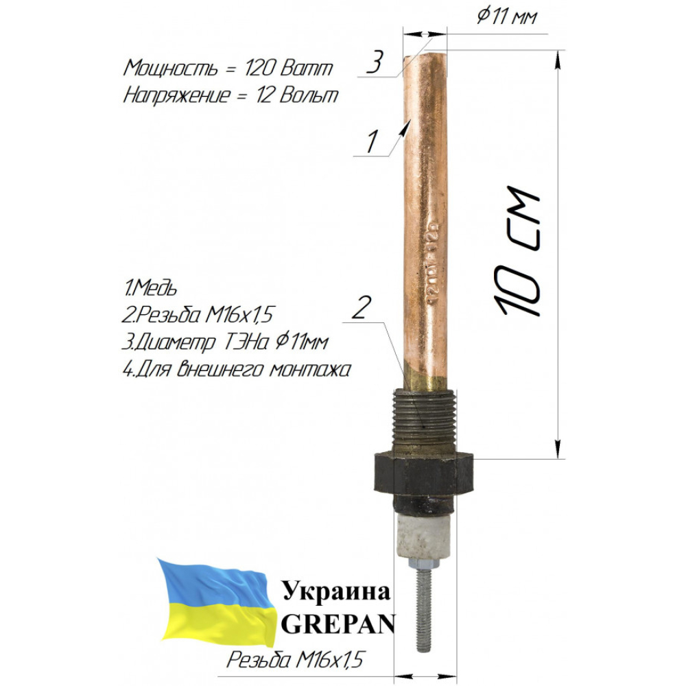 ТЕН автомобільний для поддона картера, 12В/120 Вт, мідний, М16 (зовнішній монтаж)"