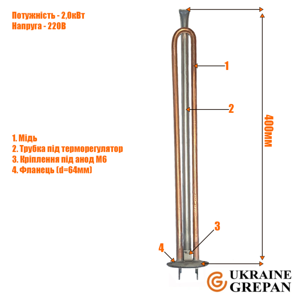 У нашому інтернет-магазині можна купити ТЕН: ТЕН для бойлера мідний, 2,0 кВт, №6 - boi06m. Також широко представлений асортимент ТЕНи для бойлерів. Широкий асортимент ТЕНів та нагрівальних елементів у магазині grepan.ua.Характеристики:Напруга, В: 220Потужність, кВт: 2,0Різьблення кріплення: 63Матеріал оболочки: МідьЗанурювальна довжина, см: 40Пайка/зварювання: зварюванняНаповнювач ТЕНу: періклазКонтакт: М4 (внутр)Місце під анод: М6Розміри труби: 9х0,7Середовище використання: водаМатеріал кріплення: Нержавійка AISI304Трубка під термодатчик: 1Метод виготовлення кріплення: штампТовщина пластини, мм: 1Діаметр трубок для термодатчиків: 8..