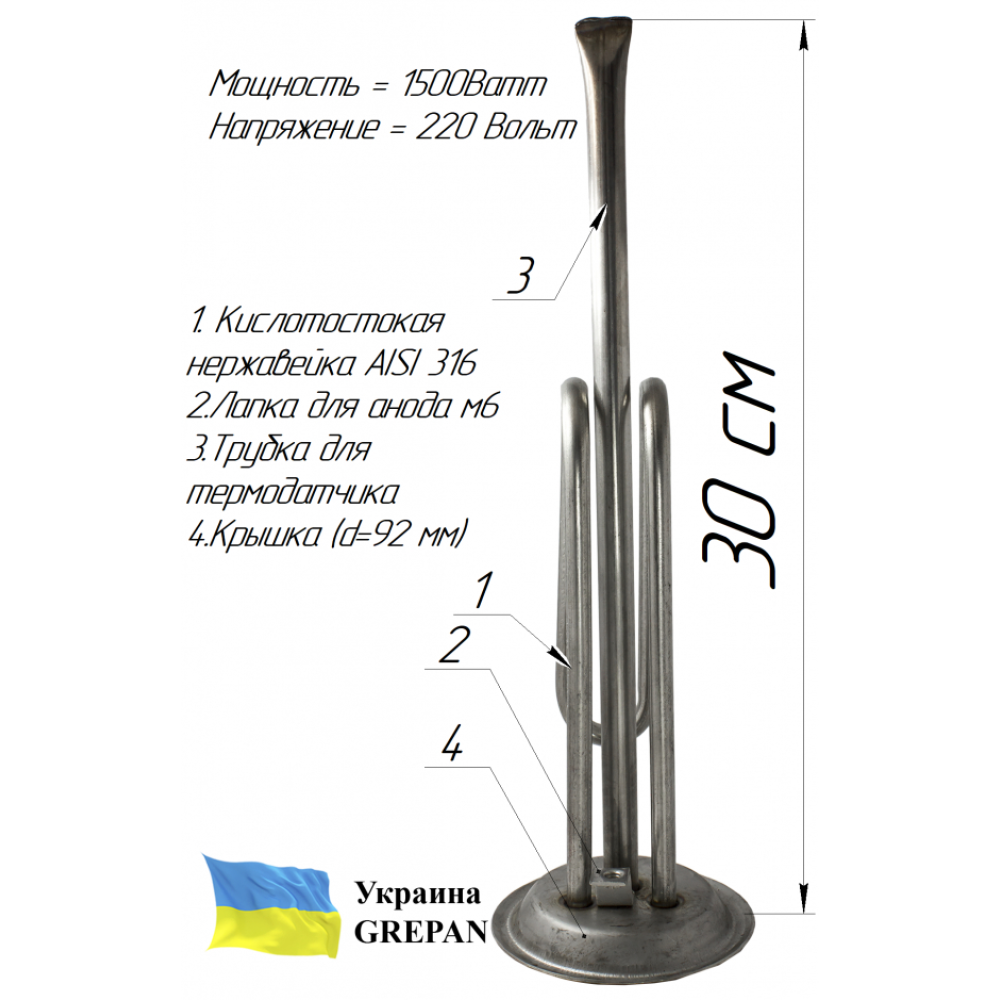 У нашому інтернет-магазині можна купити ТЕН: ТЕН для бойлера нержавіючий, 1,5 кВт, №32 - boi032. Також широко представлений асортимент ТЕНи для бойлерів. Широкий асортимент ТЕНів та нагрівальних елементів у магазині grepan.ua.Характеристики:Напруга, В: 220Потужність, кВт: 1,5Різьблення кріплення: 63Матеріал оболочки: Нержавійка, AISI 316LЗанурювальна довжина, см: 32Пайка/зварювання: зварюванняНаповнювач ТЕНу: періклазРозміри труби: 9х0,7Контакт: Контакт "папа"Матеріал кріплення: Нержавійка AISI304Трубка під термодатчик: 1ТЕНи в Блок-ТЕНі: 1000+500 ВтМетод виготовлення кріплення: штампТовщина пластини, мм: 1Діаметр трубок для термодатчиків: 8Середовище використання: водаМісце під анод: М6..