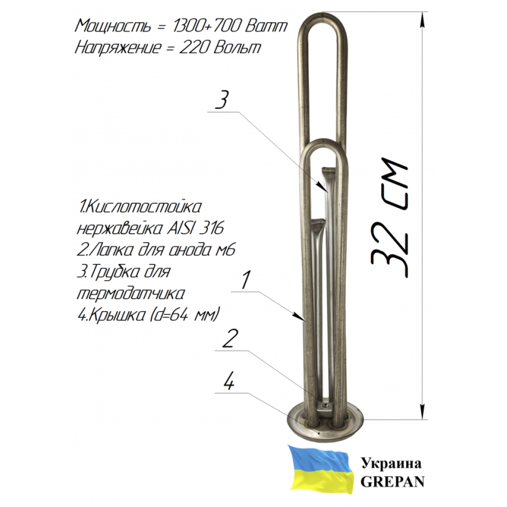 Характеристики:Напруга, В: 220Потужність, кВт: 0,4Матеріал оболочки: Вуглецева стальЗанурювальна довжина, мм: 335Наповнювач ТЕНу: Кварцовий пісокКонтакт: М3Матеріал ..