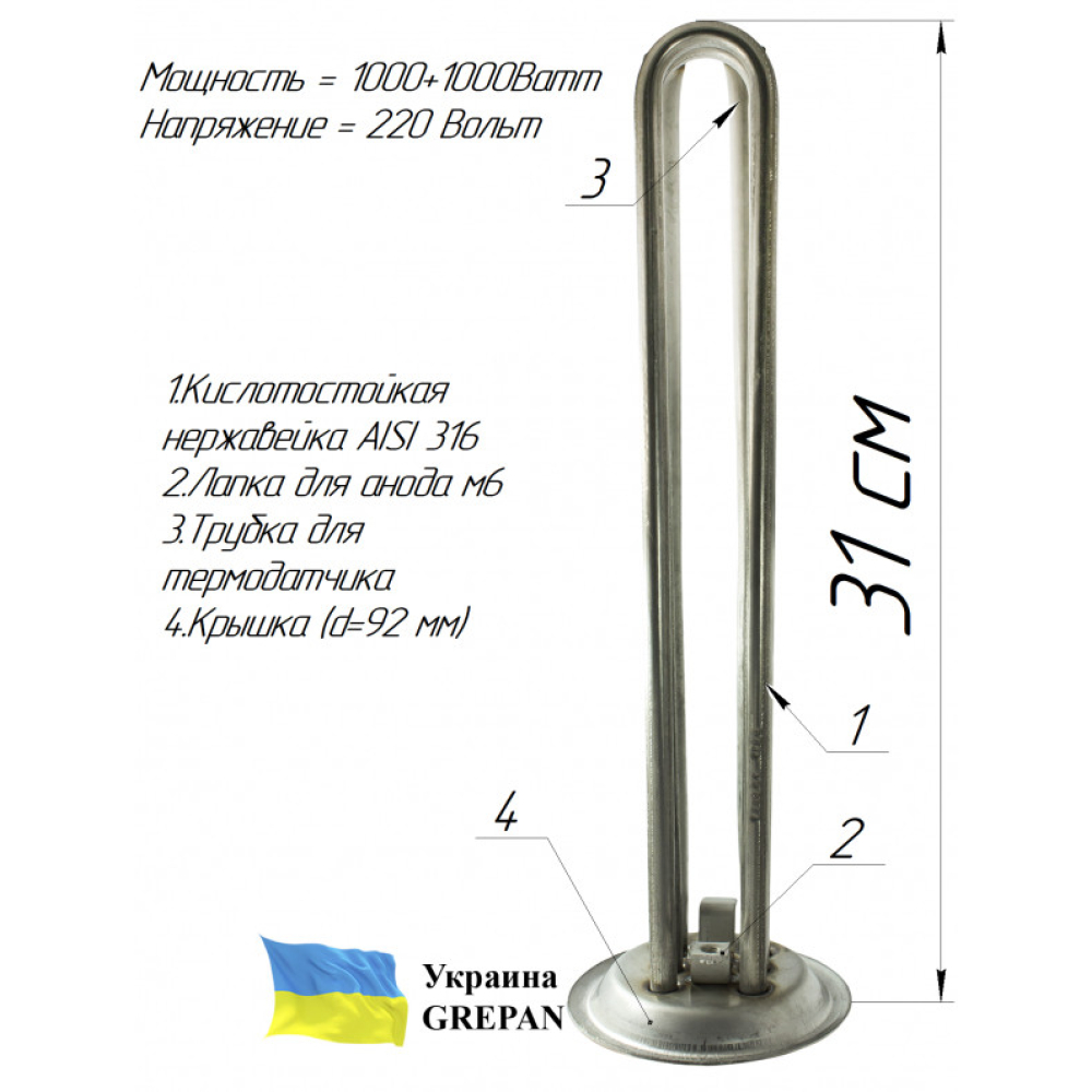 У нашому інтернет-магазині можна купити ТЕН: ТЕН для бойлера нержавіючий, 2,0 кВт, №20 - boi020. Також широко представлений асортимент ТЕНи для бойлерів. Широкий асортимент ТЕНів та нагрівальних елементів у магазині grepan.ua.Характеристики:Напруга, В: 220Потужність, кВт: 2,0Різьблення кріплення: 63Матеріал оболочки: Нержавійка, AISI 316LЗанурювальна довжина, см: 40Пайка/зварювання: зварюванняНаповнювач ТЕНу: періклазРозміри труби: 9х0,7Контакт: Контакт "папа"Матеріал кріплення: Нержавійка AISI304Трубка під термодатчик: 2Метод виготовлення кріплення: штампТовщина пластини, мм: 1Діаметр трубок для термодатчиків: 6+6Середовище використання: водаМісце під анод: М6..