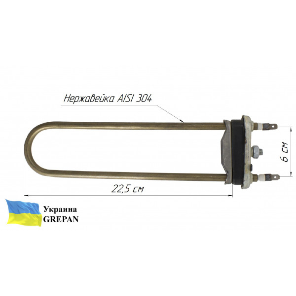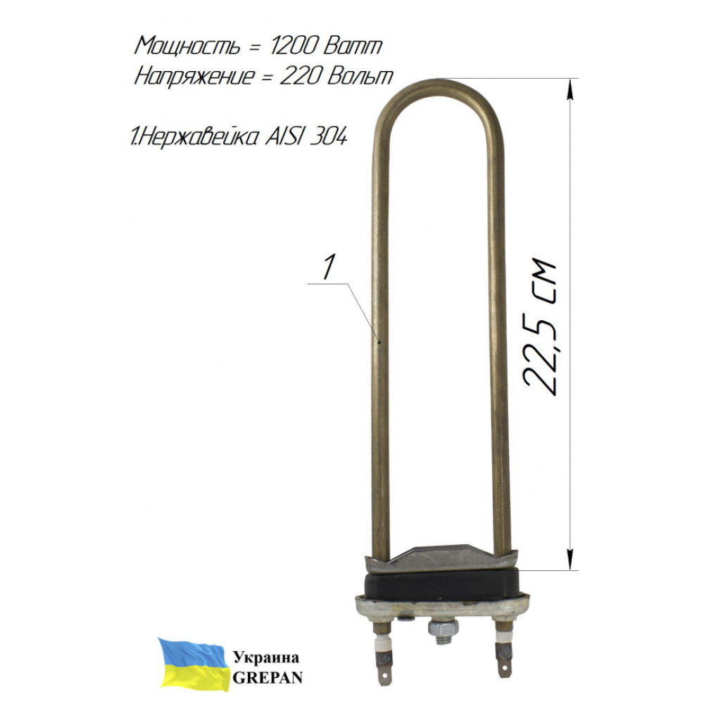 ТЕН для пральної машини без внутрішньої петлі, нержавійка, 1,2кВт, 22,5см"