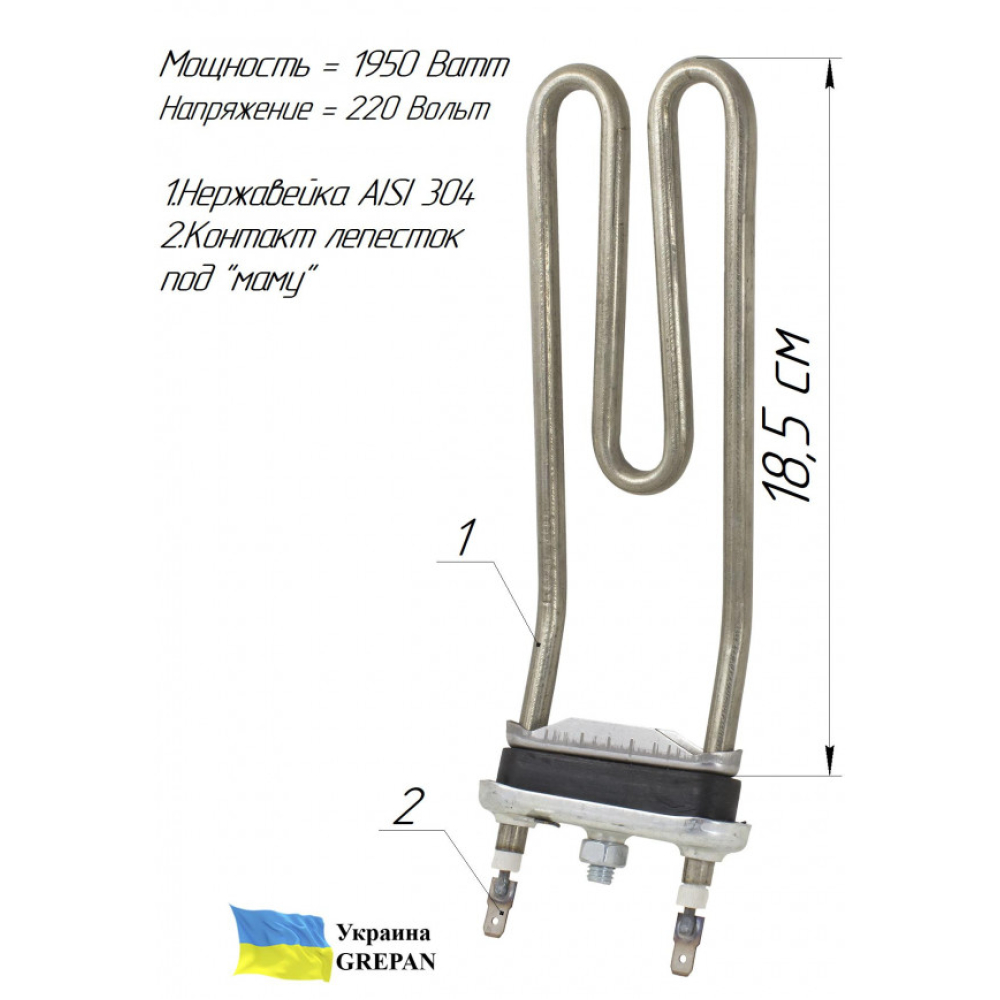ТЕН для пральної машини з плавним загином, нержавійка, 1,95кВт, 18,5см"