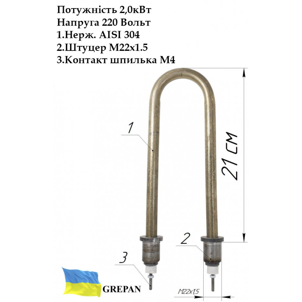 У нашому інтернет-магазині можна купити ТЕН: ТЕН для води, П-образний, нержавійка, 1,5 кВт, М22 - pobr02. Також широко представлений асортимент ТЕНи П-образні для води. Широкий асортимент ТЕНів та нагрівальних елементів у магазині grepan.ua.Характеристики:Напруга, В: 220Потужність, кВт: 1,5Різьблення кріплення: М22Матеріал оболочки: Нержавійка, AISI 304Занурювальна довжина, см: 18,5Пайка/зварювання: зварюванняНаповнювач ТЕНу: кварцевий пісокРозміри труби: 14х1,0Контакт: М4 шпількаМатеріал кріплення: Вуглецева стальДовжина різьби кріплення, мм: 25Метод виготовлення кріплення: точенийМіжосьова відстань, мм: 70Середовище використання: вода..